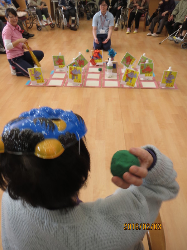 フロア内に並べて・・・標的の「鬼」に向かって「鬼は外!」・「福は内!」の掛け声に合わせて投げて頂きました!日頃のストレスがあるのかバッタンバッタンと鬼を倒されていました(^_^;)