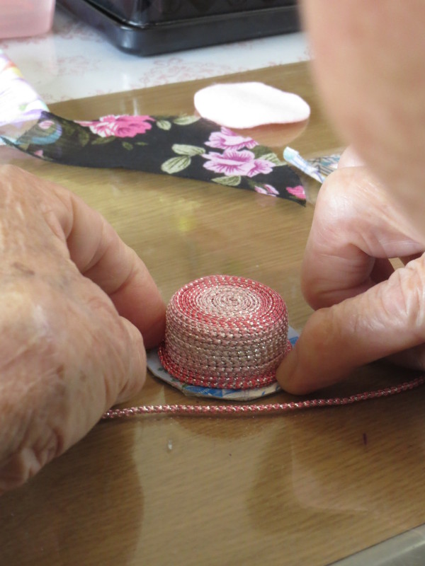 次にキャップの下に台紙をおき、台紙にも糸をグルグルと巻きつけていきます。帽子の様な形になっていきます。その後は、フリルなどを付けると完成です♪