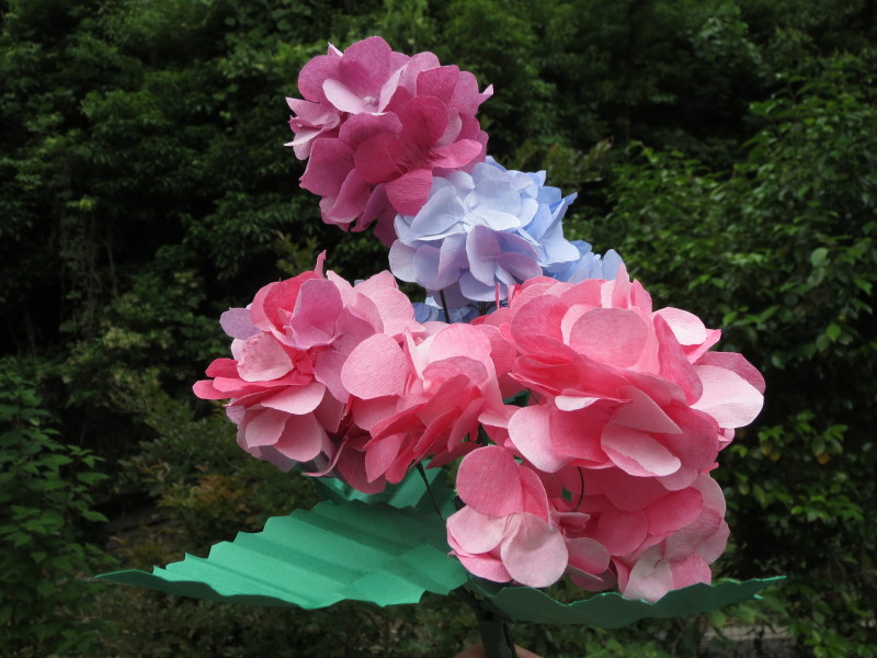最後に葉を付け合せたら「紫陽花」の完成です。コーヒーフィルターの色のグラデーションと花びらを絞って張り付ける事で、完成度が増し本物の様に感じませます♪