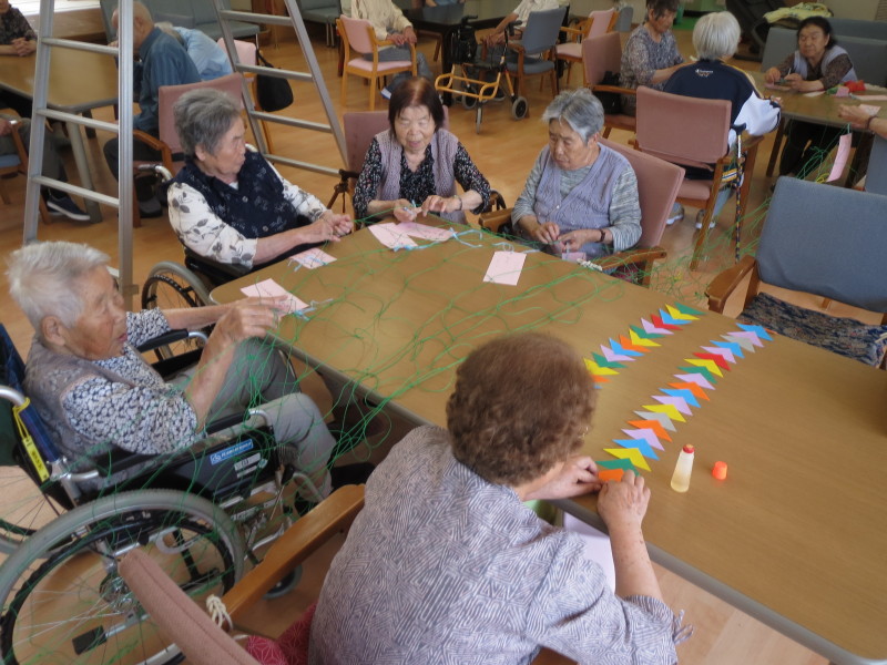 7月3日(月)に御利用者様全員で「飾りつけ」を行いました。毎年、竹を近隣の山で頂いていますが今回は飾り方を変え、植物用のネットに飾りつけを行い、それを天井に天の川の様に見たてて吊るしてみました☆いつもとは違う飾りつけですが、なかなか迫力があり素敵な仕上がりになりました!