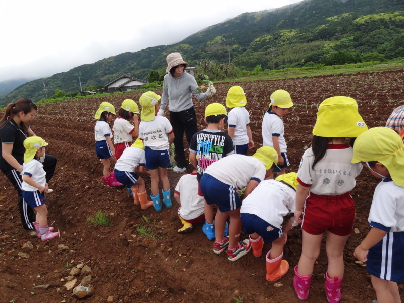 6月9日(火)柚木町に行ってきました。広大なよかもん市の畑をお借りし、芋苗植えの先生に植え方のコツを教わりながらみんなで植えていきました。畝をきれいに作って、穴まで掘っていただいていたので、とてもありがたかったです。大きなお芋ができるといいな~はやくおおきくなあれ~