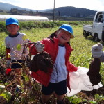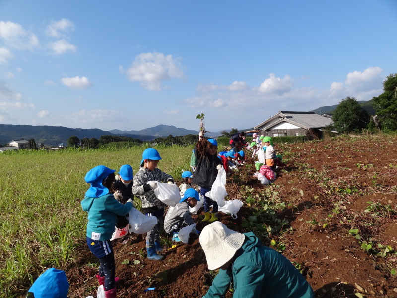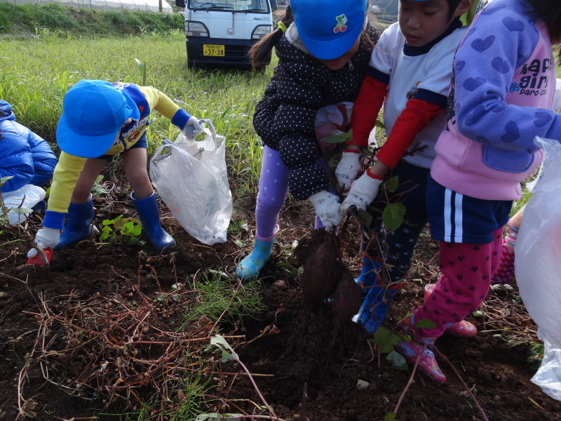 毎年恒例の柚木町でのお芋掘り、今年もいい天気に恵まれました。よかもん市のおじさんが、大きなスコップでテコ入れしてくれ、蔓をひっぱると、すぐに、おっきいおいもがごっろごろ・・・。