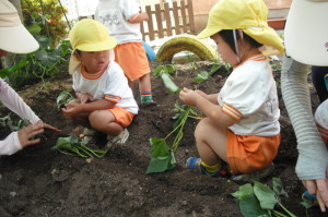 2・3歳児は、園庭にある畑で芋苗さしをしました。「大きくなってね」「おいしいおいもがたくさんできますように」と、言いながら泥のお布団をそっと掛けていました。