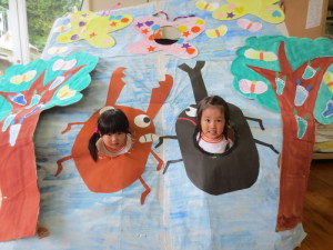 4・5歳児が作った海と0歳児から3歳児の手形でできた魚のモニュメントを囲み、お父さんやお母さんおじいちゃんおばあちゃんと一緒に踊った盆踊り、子ども達が踊りながら歌う姿に「よく覚えてるね」とおばあちゃんが誉めてくださり、嬉しそうな子ども達。小学生のお姉さん達も少し照れながら踊ってくれました。