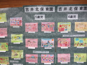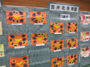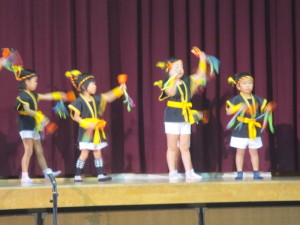 大きな舞台での演技披露に、どきどきの子ども達でしたが遊いた戯披露の頃には緊張もなくなり堂々と元気に踊ってくれました。また、会場内には2歳児から5歳児までの絵の掲示物や、年長児の生け花や製作の展示もあり、保護者の方々もたくさん参加して頂きました。