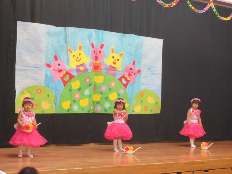 0歳児から5歳児までの園児がお遊戯や、劇遊び、合奏などを披露して保護者・地域の方々のたくさんの拍手に励まされ演技することが出来ました。たくさんのお客さんに緊張した様子で泣き出したり、恥ずかしくて、てれる子もいましたが個々に成長が感じられた発表会なり、この経験が大きな自信となったようでした。