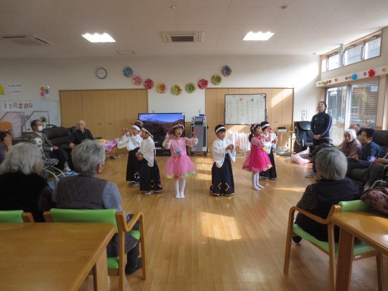 年長児7名が吉井介護事業所に訪問しました。発表会で踊ったお遊戯と手話を披露しました。手話では、「にじ」の曲に合わせて大きな声で歌うことが出来、利用者の方も一緒に手を動かして楽しまれていました。ふれあい遊びでは、ぴったんこのリズムに合わせ、手や頬をくっつけたり、抱きしめあったりし子ども達も利用者の方も喜んでいました。