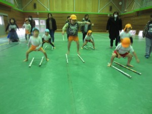 新聞紙を使ったゲームをしたり、バンブーダンスを親子で挑戦しました。新聞棒を使い、リズムに合わせて足を開いたり閉じたりし、子ども達も保護者に仕方を伝えながら楽しんで活動しました。