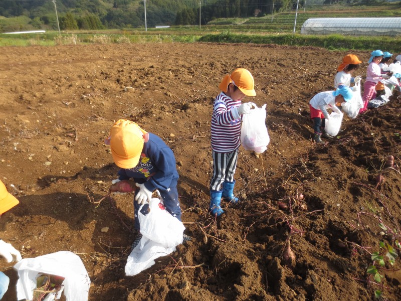 芋ほりで掘った芋を使って、クッキングでさつま芋チュロスを作りました。クッキングを楽しみにしていた子ども達。3歳児は、ピーラーで皮をむき、4・5歳児が包丁で切りました。「お家でお手伝いしよるよ。」「したことある!」と言って、やる気満々!握る手に力が入っていて、保育士が手を添えてゆっくりとしていきました。芋をつぶしたり混ぜたりするときは、ボールを押さえ協力しながら出来ました。絞り袋を使って、ハートやグルグル巻きなど好きな形を作って楽しみました。形を作った後は、調理の先生に揚げてもらい、楽しみにしていたおやつの時間!出来上がりを見せると、嬉しそうに見せ合い「おいしいね~」「また、したいね」と楽しいクッキングになったようです。